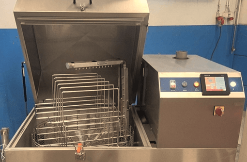 The machine’s performance is supported by an efficient hot-air drying system, which completes the process without the need for a separate rinsing stage. A typical cleaning cycle takes approximately ten minutes, making the system fast and highly beneficial for production efficiency. Short cycle times also enable continuous use without long production interruptions.
